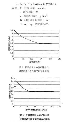 過濾風(fēng)速的選取是袋式除塵器設(shè)計(jì)的關(guān)鍵參數(shù),直接關(guān)系到除塵效率的高低。本文在對工程應(yīng)用中的各除塵器的相關(guān)參數(shù)測定后,通過曲線擬合,得出過濾風(fēng)速與廢氣溫度、廢氣中的煙粉塵濃度、煙粉塵粒徑之間的數(shù)學(xué)模型。同時經(jīng)檢驗(yàn)采用該模型來指導(dǎo)設(shè)計(jì),在一定范圍內(nèi)是可行的。
