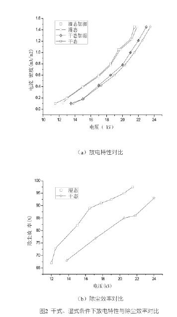 實驗對比研究了干、濕式條件下電除塵器的除塵性能。陰極線選用針刺線,停留時間約為1s,入口粉塵濃度為29mg/m3,噴嘴選用實心錐噴嘴,噴淋流量為60L/h。為更好地證明液滴對脫除效率的影響,采用超聲波加濕器霧化產(chǎn)生液滴,將液滴通入管道內(nèi),與不通入液滴的情況進行對比。