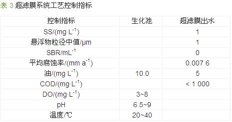 超濾膜采用德國(guó)BERGHOF膜組件,膜道8 mm,膜孔30 nm。經(jīng)生化處理后的含油廢水由進(jìn)水泵打入超濾膜系統(tǒng),膜系統(tǒng)產(chǎn)水經(jīng)轉(zhuǎn)子流量計(jì)計(jì)量后排入凈水罐,部分濃水回流至生化系統(tǒng),部分濃水由循環(huán)泵與進(jìn)水混合重新進(jìn)入超濾膜〔7〕。超濾膜處理系統(tǒng)流程見(jiàn)圖 3。工藝控制指標(biāo)見(jiàn)表 3。