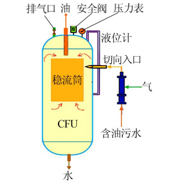 CFU工作原理如圖 1所示。采出水主體水流先經(jīng)自制的微氣泡發(fā)生器注入大量的微氣泡,然后沿切向入口進入浮選罐,在罐壁與內(nèi)部穩(wěn)流筒之間形成的環(huán)形空間內(nèi)產(chǎn)生旋流,旋流引起的離心力場驅(qū)使氣泡與油滴**黏附,黏附氣泡后的油滴與水的密度差進一步加大,進而加速浮升,提高了油水分離效率,實現(xiàn)對生產(chǎn)水的**處理,同時大大縮短水力停留時間,減小了處理設備的尺寸。其中,自行研制的微氣泡發(fā)生器利用微孔發(fā)泡機理,通過微孔對氣流進行連續(xù)剪切后經(jīng)水流沖刷而形成微氣泡,有效規(guī)避了常規(guī)氣泡發(fā)生方式能耗高、產(chǎn)生氣泡性能差、剪切乳化程度高等不足〔4, 5, 6〕,微氣泡發(fā)生器的優(yōu)越性能也為CFU除油效率的提高提供了保障