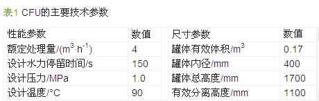 CFU的浮選罐外形尺寸為D 0.4 m×1.7 m,微氣泡發(fā)生器外形尺寸為D 76 mm×700 mm?,F(xiàn)場試驗時CFU采用2個立式氣浮罐串聯(lián)成撬,總體尺寸為1 430 mm×1 200 mm×2 370 mm,凈重≤1.5 t。其他參數(shù)如表 1所示。