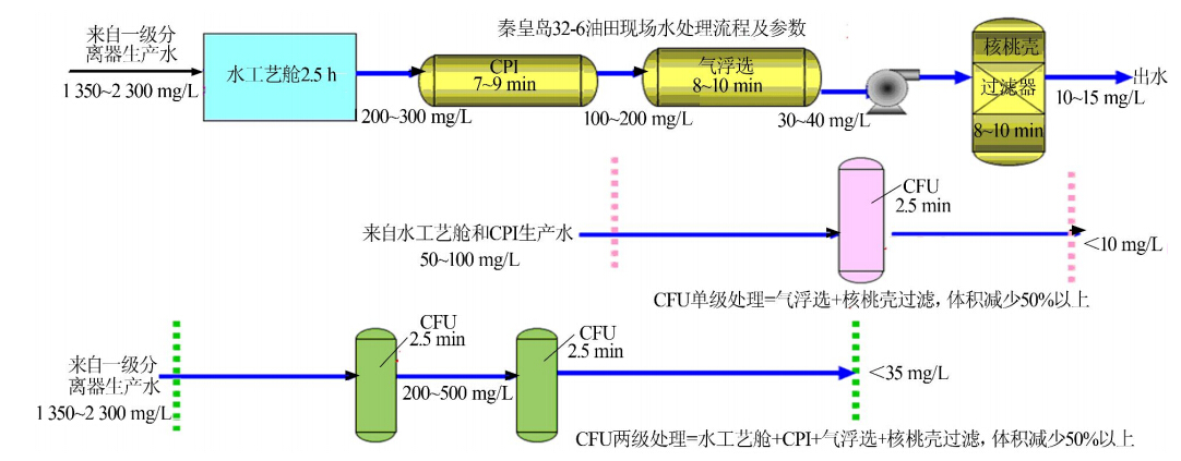 由圖5可以看出,單級CFU在入口含油50~100 mg/L、水力停留時間2.5 min時的處理效果與現(xiàn)場應用氣浮選+核桃殼過濾相當,設備體積可減少50%以上;采用兩級CFU串聯(lián),在入口含油1 350~ 2 300 mg/L、總水力停留時間為5 min時的處理效果與現(xiàn)場應用水工藝艙+斜板除油器+氣浮選+核桃殼過濾的效果相當,設備體積可減少50%以上。顯然,采用CFU可以減少水處理設施的串聯(lián)級數(shù)或大大減小設備體積,這對于海上油田而言極具應用優(yōu)勢。