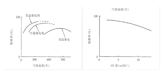 對(duì)催化劑性能影響較大的因素有反應(yīng)溫度、催化劑量、氨的注入量,如圖3所示。由于在250~450 ℃(**好是350~400 ℃) ,催化劑有**佳活性,通常脫硝反應(yīng)設(shè)定在這個(gè)溫度范圍內(nèi)。當(dāng)反應(yīng)溫度不在這個(gè)溫度范圍內(nèi)時(shí),催化劑的性能將降低,尤其是在高溫區(qū)域使用時(shí),由于過熱促使催化劑的表面被燒結(jié),使催化劑壽命降低。